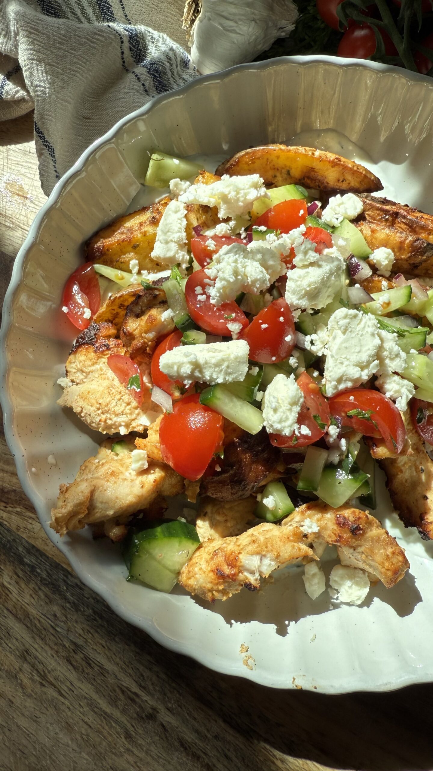 1 In a large bowl, combine the Greek yogurt, lemon zest, lemon juice, garlic, paprika, cumin, coriander, salt, and pepper. 2 Add the sliced chicken and toss to coat evenly. Let it marinate for at least 30 minutes (or up to 12 hours for deeper flavor). 3 In a large bowl, toss the potato wedges with garlic powder, onion powder, parsley, paprika, salt, pepper, and olive oil. 4 Preheat the air fryer to 400°F. 5 Arrange the potatoes in a single layer in the air fryer basket. Cook for 10-15 minutes, shaking halfway through, until golden and crispy. 6 After removing the potatoes, place the marinated chicken in the air fryer basket. 7 Cook at 400°F for 6–8 minutes, shaking or flipping halfway through, until cooked through (internal temp should reach 165°F). 8 Combine the shredded cucumber, Greek yogurt, dill, olive oil, garlic, lemon juice, and lemon zest in a bowl. 9 Season with salt and pepper to taste. 10 Combine the chopped cucumber, cherry tomatoes, parsley, lemon juice, olive oil, salt, and pepper in a small bowl. 11 Toss gently to combine. 12 Assemble the Bowls 13 Start with a layer of tzatziki at the bottom of each bowl. 14 Add the crispy potatoes and Greek chicken. 15 Top with the cucumber salsa and crumbled feta cheese.View original recipe