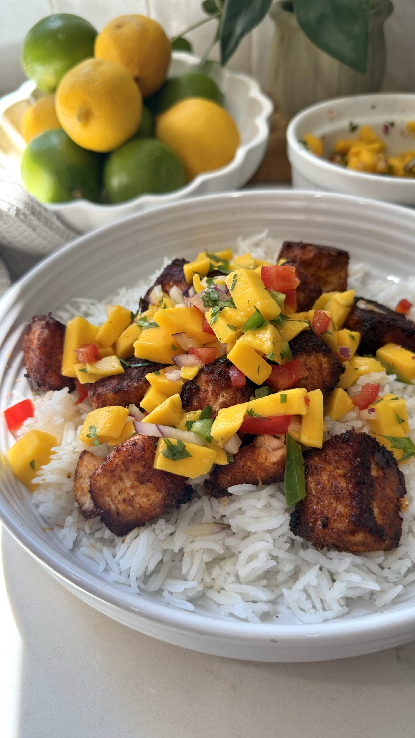 1 Make the Dry Rub: In a small bowl, mix paprika, garlic powder, chili powder, onion powder, salt, and pepper. Stir in honey or brown sugar to form a paste. 2 Season the Salmon: Pat salmon dry. Rub with olive oil, then coat evenly with the dry rub. 4 Cook the Salmon: Oven: Bake at 400°F for 12–15 minutes, or until flaky. 5 Grill: Grill over medium-high heat for 4–5 minutes per side. 6 Air Fryer: Air fry at 400°F for 8–10 minutes. 7 Make the Mango Salsa: Mix mango, bell pepper, red onion, jalapeño, lime juice, cilantro, and salt in a bowl. 8 Assemble the Bowls: Add rice and avocado to each bowl. Top with salmon and mango salsa. Drizzle with BBQ sauce or a squeeze of lime and serve with greens or cabbage if desired.View original recipe