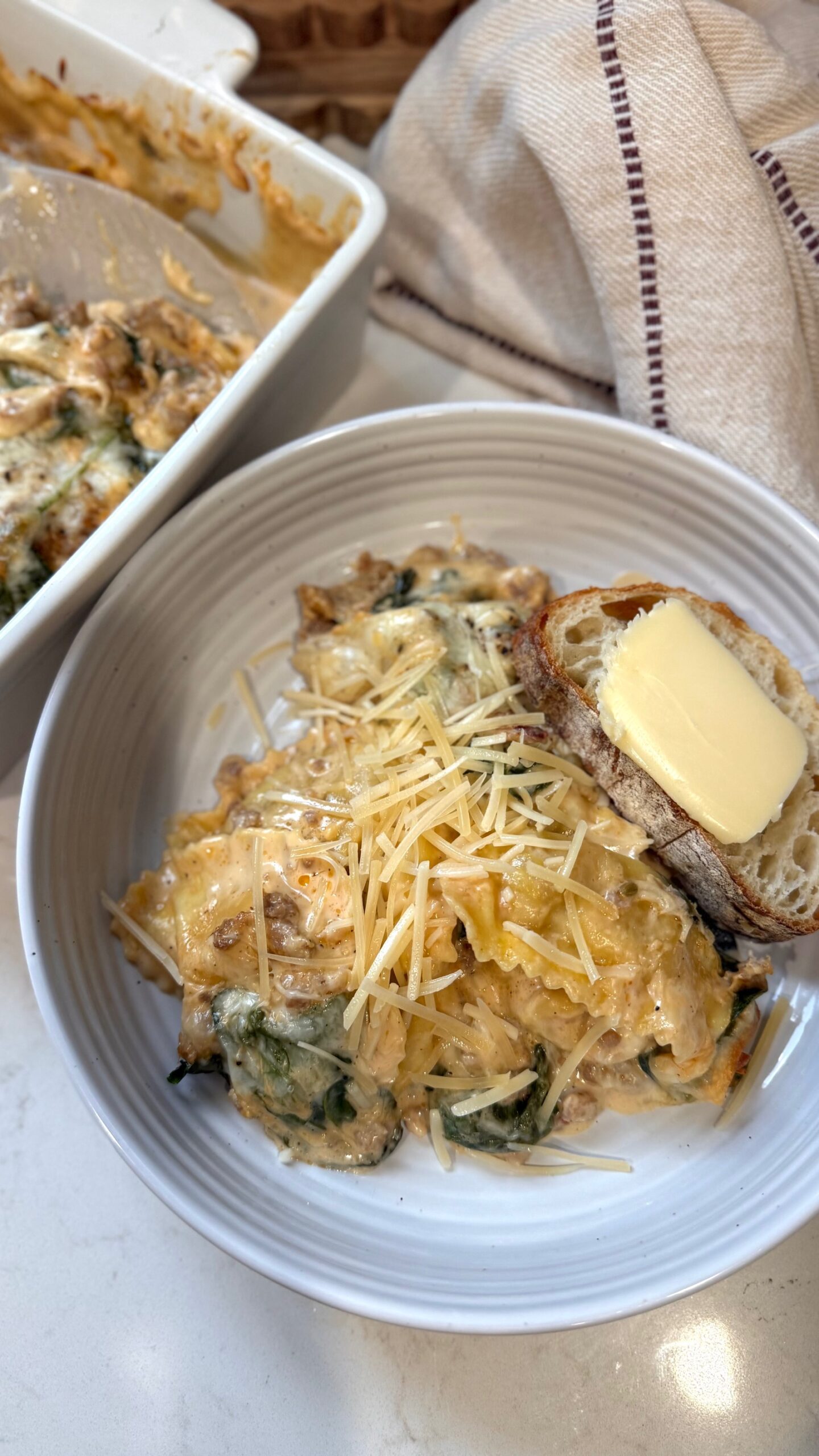 This creamy white ravioli bake layers Alfredo sauce, Italian sausage, spinach, and cheese for a cozy, semi-homemade weeknight dinner that’s ready in 30 minutes.
