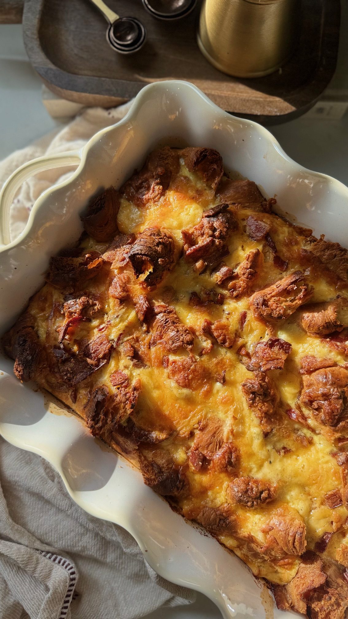 4 Cook the bacon: Fry or bake bacon until crispy, then chop into small pieces. 2 Prep the croissants While the bacon is cooking tear croissants into rustic chunks and scatter them in a greased 9×13 casserole dish. 7 Make the custard: Whisk together the eggs, half & half, blended cottage cheese, garlic powder, onion powder, salt, and pepper. 5 Sprinkle bacon evenly over the croissants. 9 Slowly pour the custard all over the croissants and bacon. 10 Let it soak for 10 minutes. 12 Sprinkle shredded cheese over the top. 14 Bake at 350°F for 35–40 minutes, or until golden, puffed, and the center is set. 16 Right out of the oven, drizzle generously with hot honey and finish with flaky salt. 18 Cut into squares, garnish with green onions, and serve warm.View original recipe