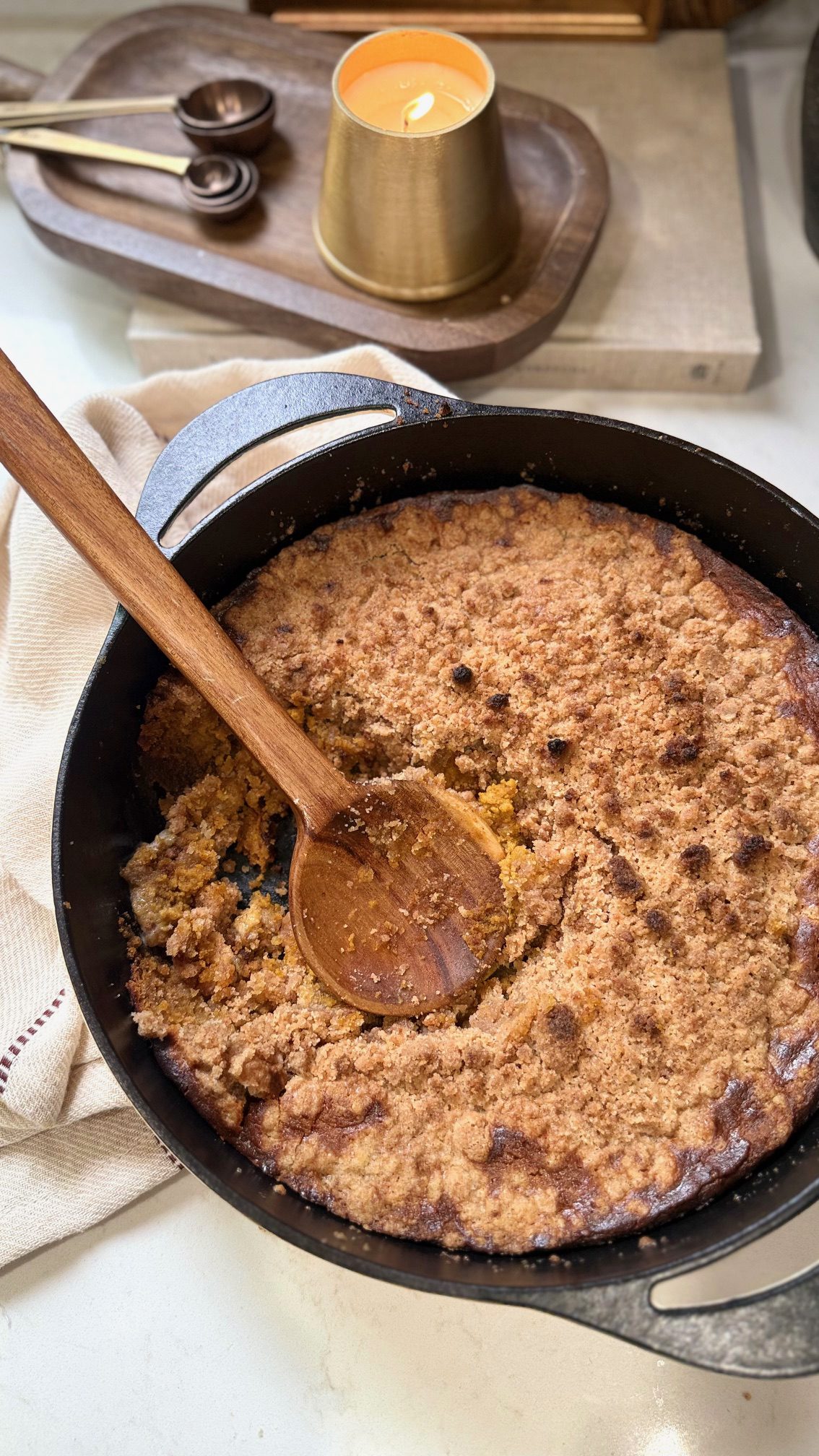 This Pumpkin Pie Crumble Skillet is the easiest, coziest alternative to pumpkin pie—made with a silky pumpkin filling and a buttery cinnamon crumble that’s not too sweet. Perfect for Thanksgiving or fall gatherings and best served warm with melty vanilla ice cream.